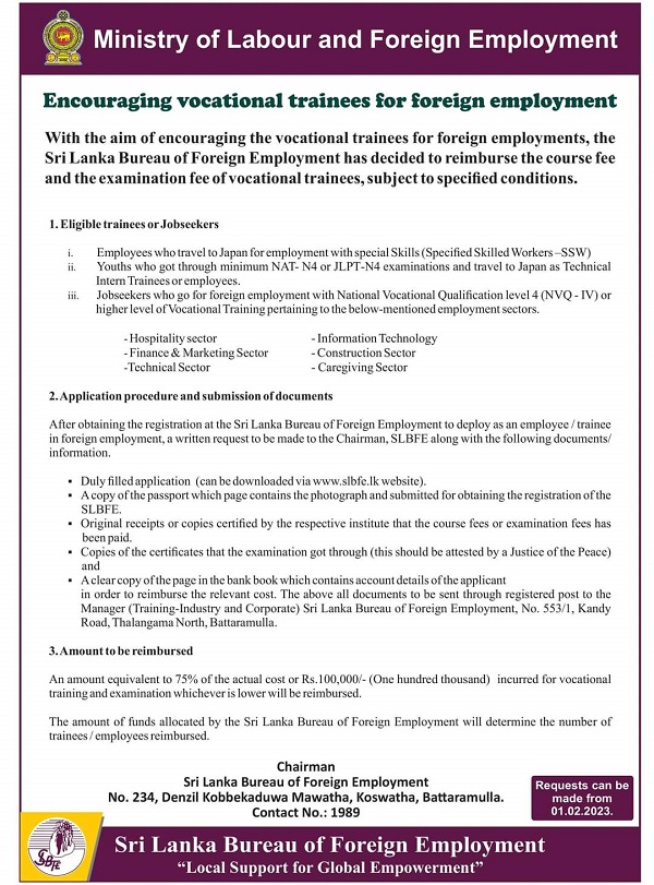 The Sri Lanka Bureau of Foreign Employment (SLBFE) has announced the reimbursement of the course or examination fee for Sri Lankan vocational trainees.