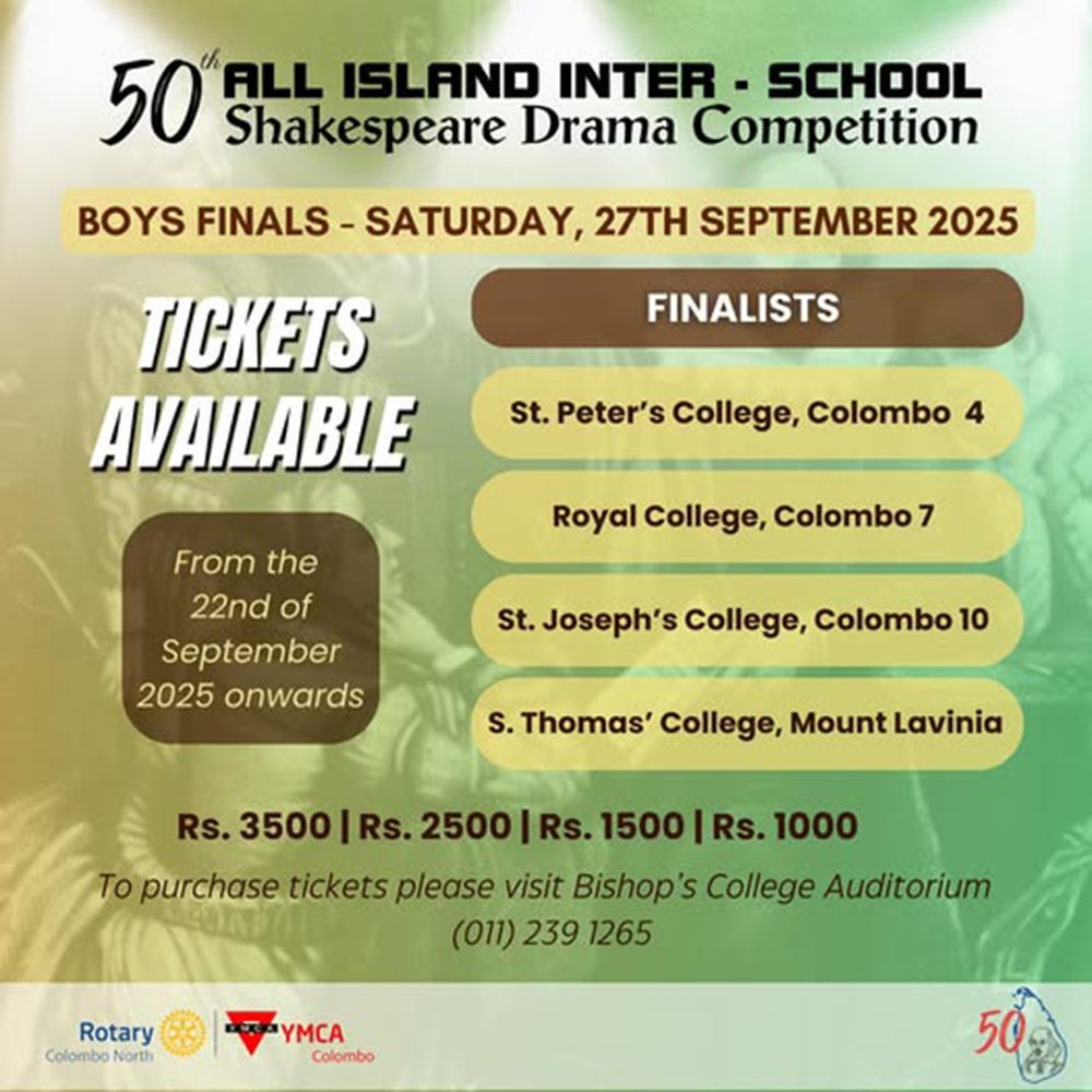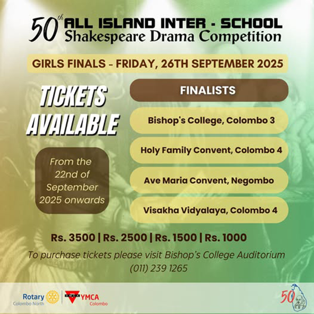 The 50th All Island Inter-School Shakespeare Drama Competition has taken the spotlight as the most anticipated school theatre festival this year. The competition will take place on Friday, 26th September 2025 at the Bishop’s College Auditorium, featuring two categories.