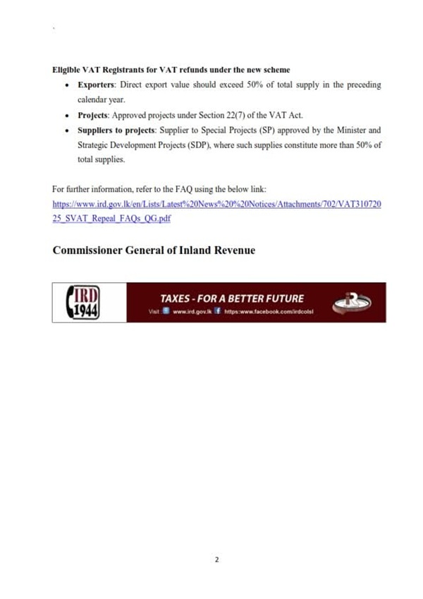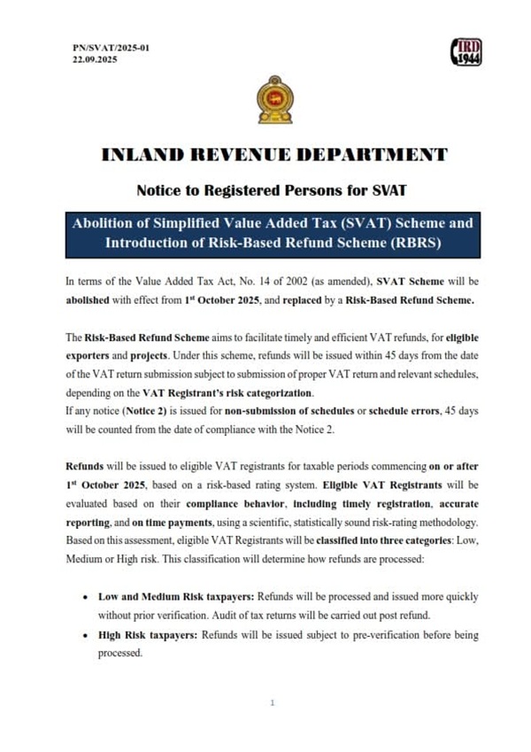 Issuing a notice for registered persons for SVAT, the IRD states that the SVAT scheme will be abolished with effect from 01st October 2025 and will be replaced by the Risk-Based Refund Scheme.