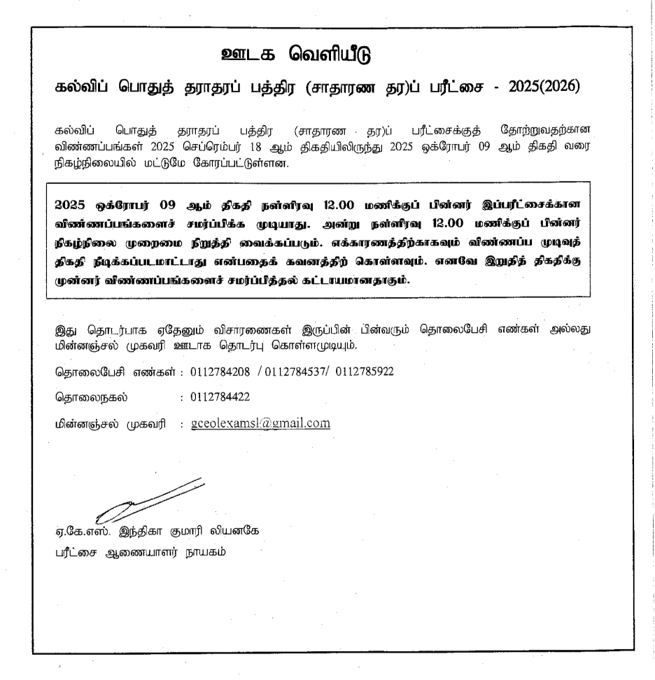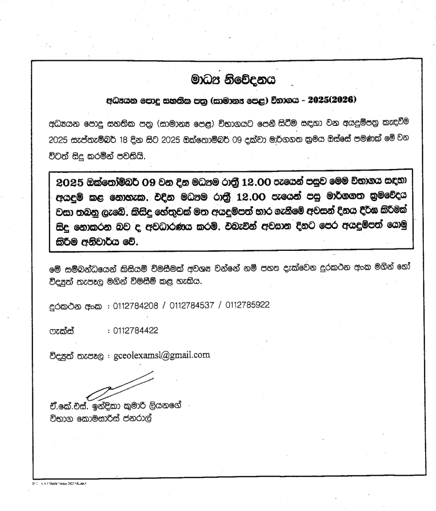The deadline to submit applications for the GCE Ordinary Level Examinations 2025 (midnight October 9) will not be extended under any circumstances.