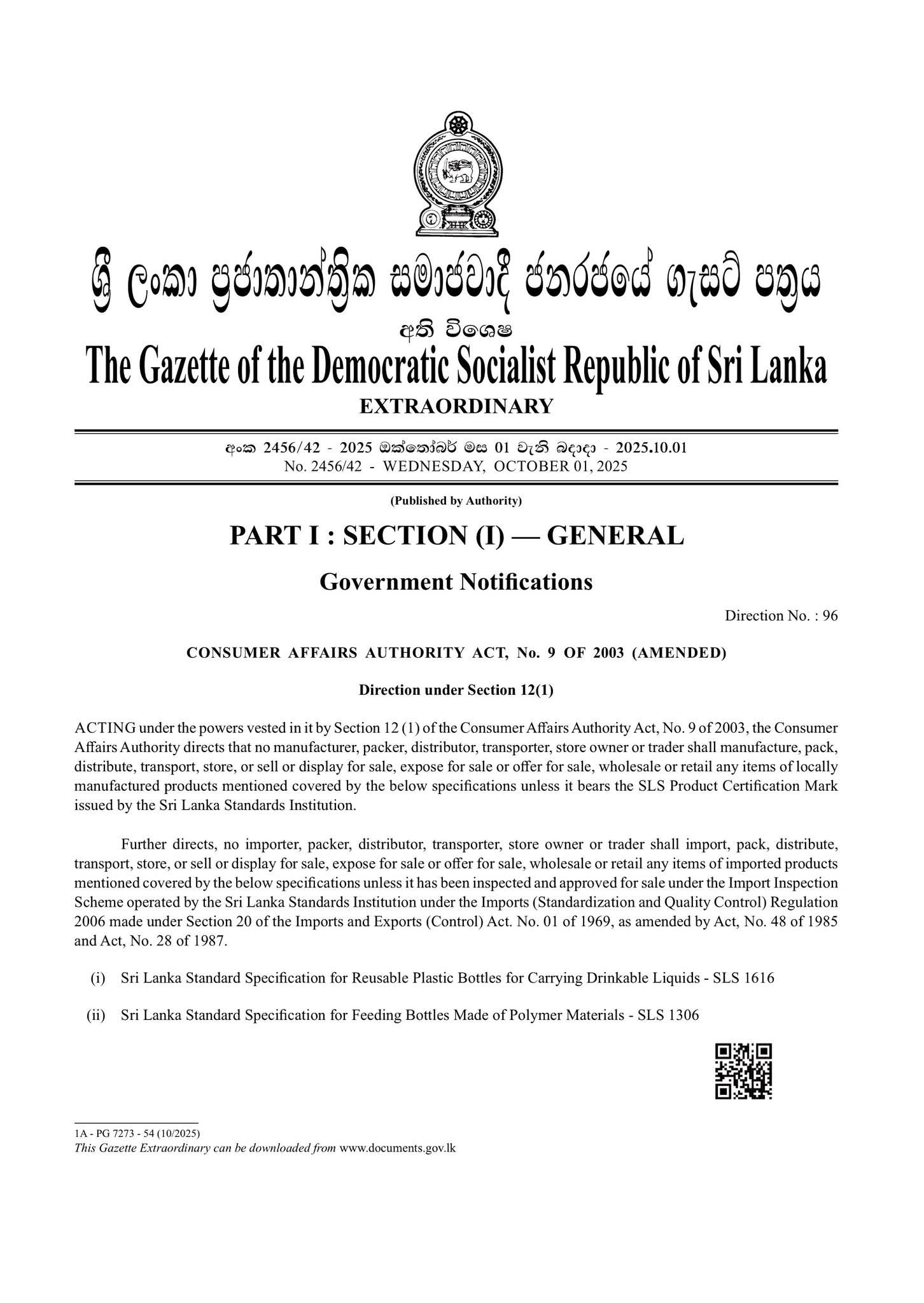 The order covers two key categories: the Sri Lanka Standard Specification for Reusable Plastic Bottles for Carrying Drinkable Liquids (SLS 1616) and the Sri Lanka Standard Specification for Feeding Bottles Made of Polymer Materials (SLS 1306).