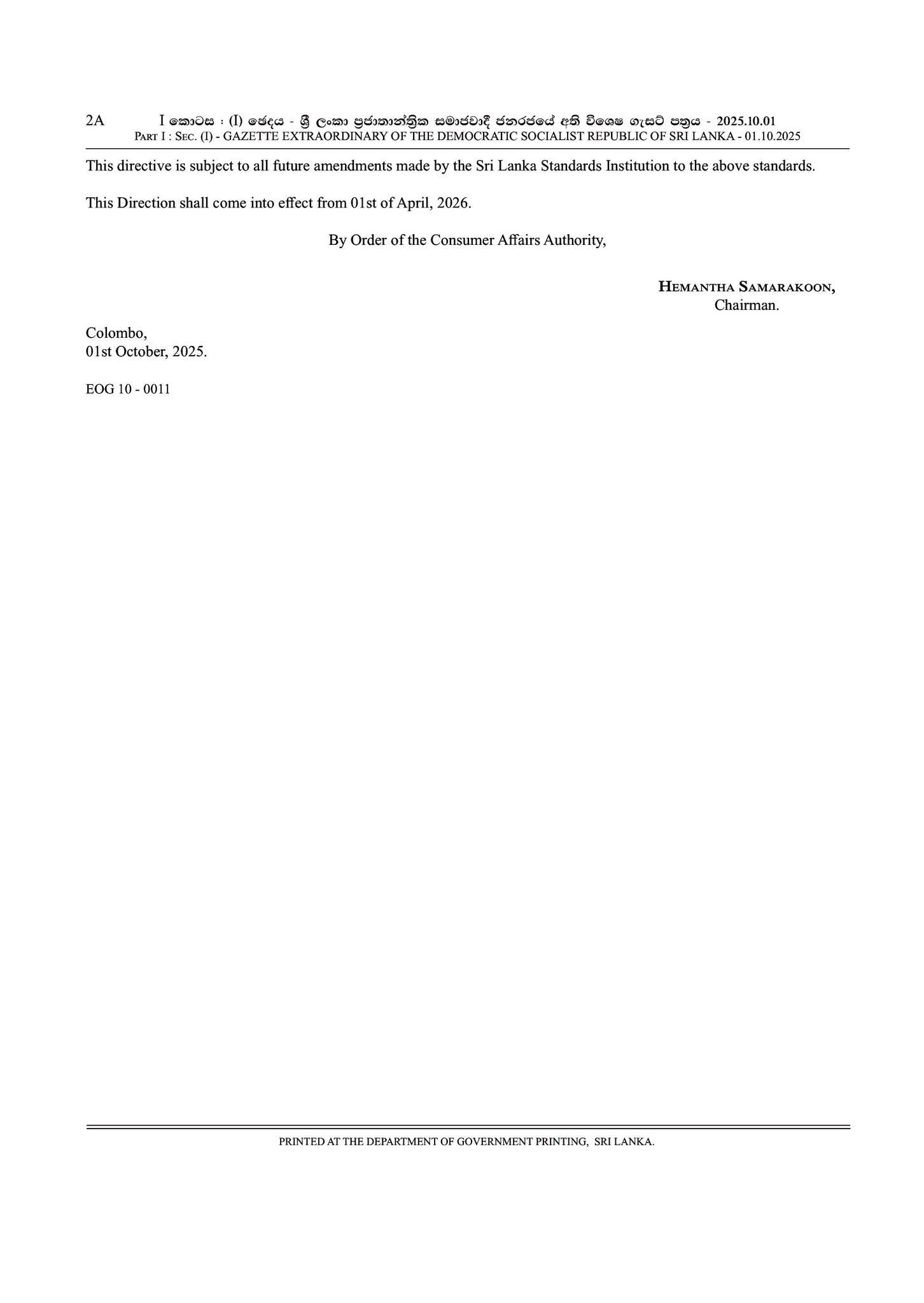 CAA Chairman Hemantha Samarakoon signed the directive, which was issued under the Consumer Affairs Authority Act No. 9 of 2003 and regulations made under the Imports and Exports (Control) Act.