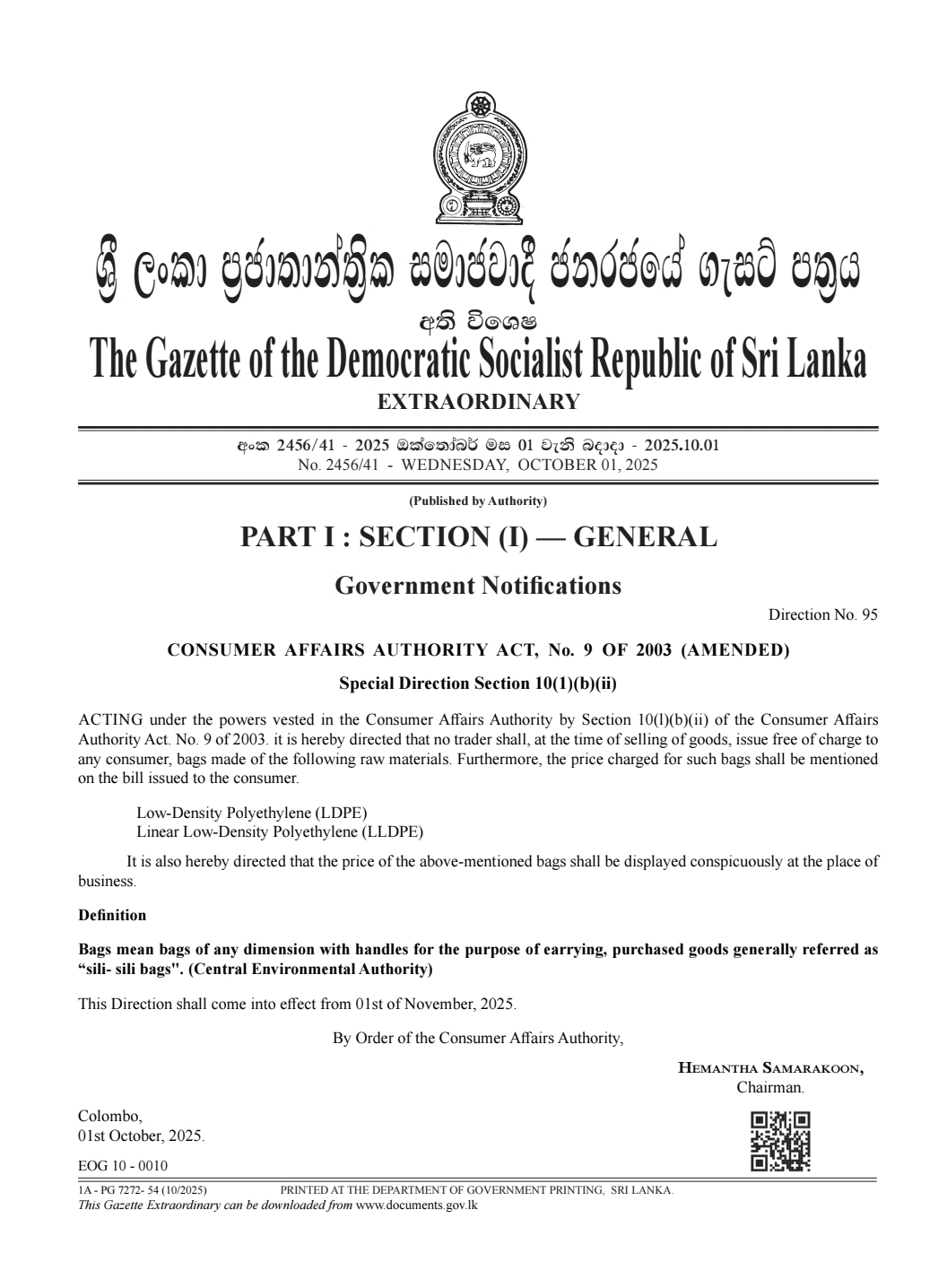 The Consumer Affairs Authority has issued a special direction prohibiting traders from issuing polythene shopping bags free of charge to consumers from November 1, 2025.