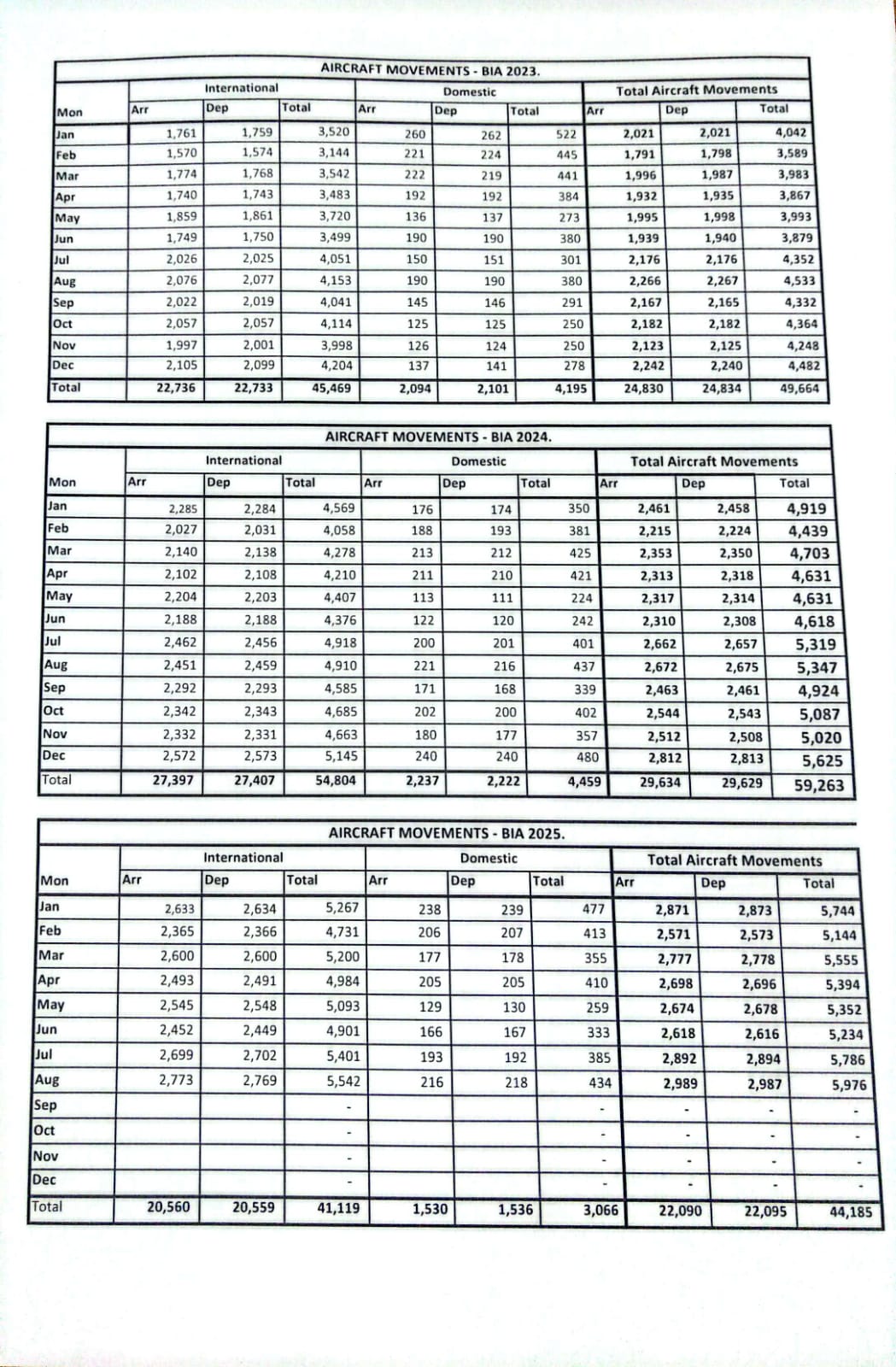 From January to August 2025, the airport handled 44,185 flight movements, compared with 38,607 during the same period in 2024. The highest number of flights this year was recorded in August, with 5,976 movements.