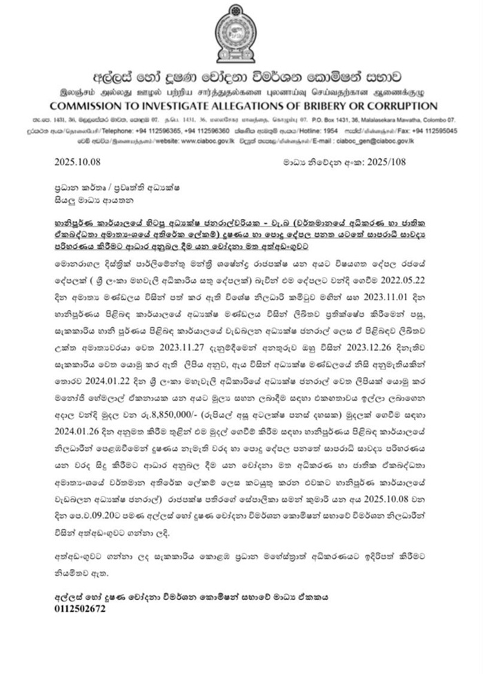 The official is identified as the second suspect in the bribery investigation against Shasheendra Rajapaksa. She allegedly pressured government officials to approve a compensation payment of Rs. 885,000, misusing state property in the process, during her tenure as the former Acting Director General of the Office for Reparations.