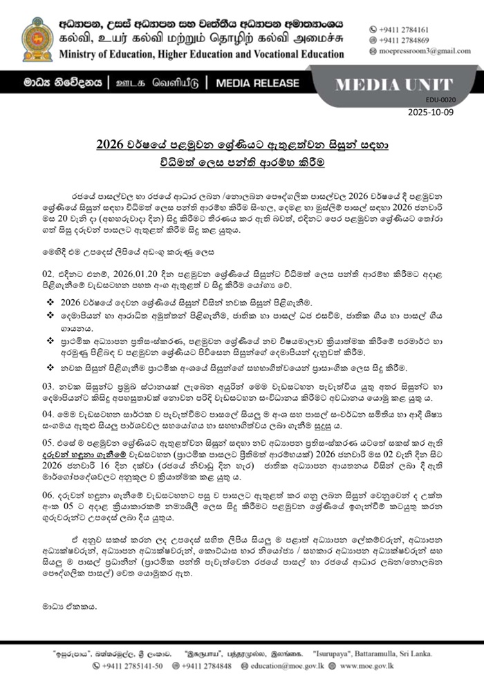 The Ministry of Education has announced that Grade 1 classes for the 2026 academic year will officially commence on Tuesday, January 20, 2026, in all Sinhala, Tamil, and Muslim medium schools across Sri Lanka.