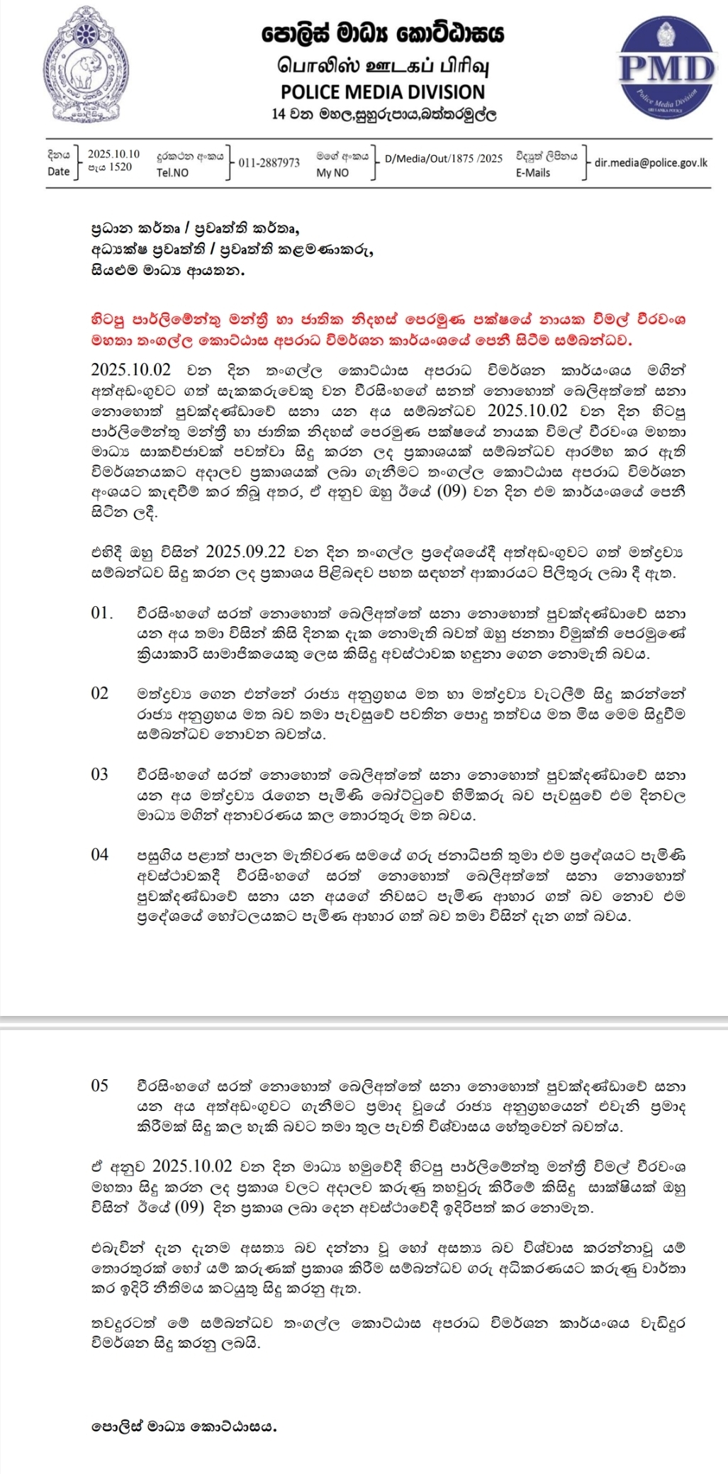Police noted that during questioning on October 9, Weerawansa did not produce any evidence to substantiate his earlier public claims made at a media briefing on October 2.