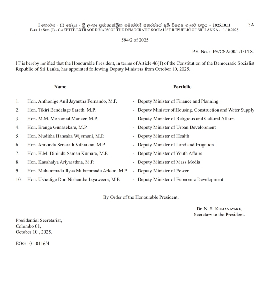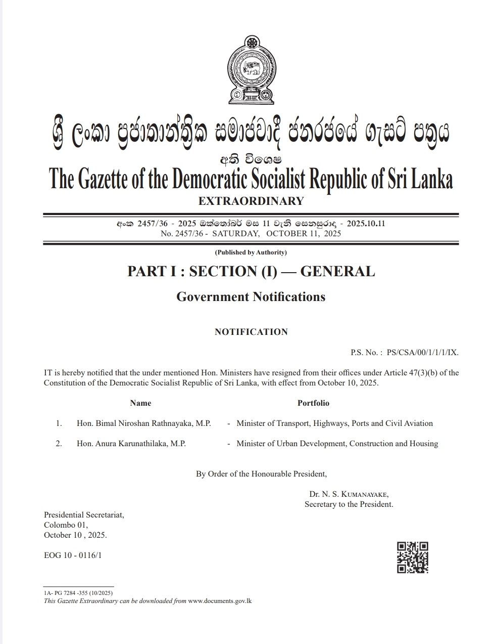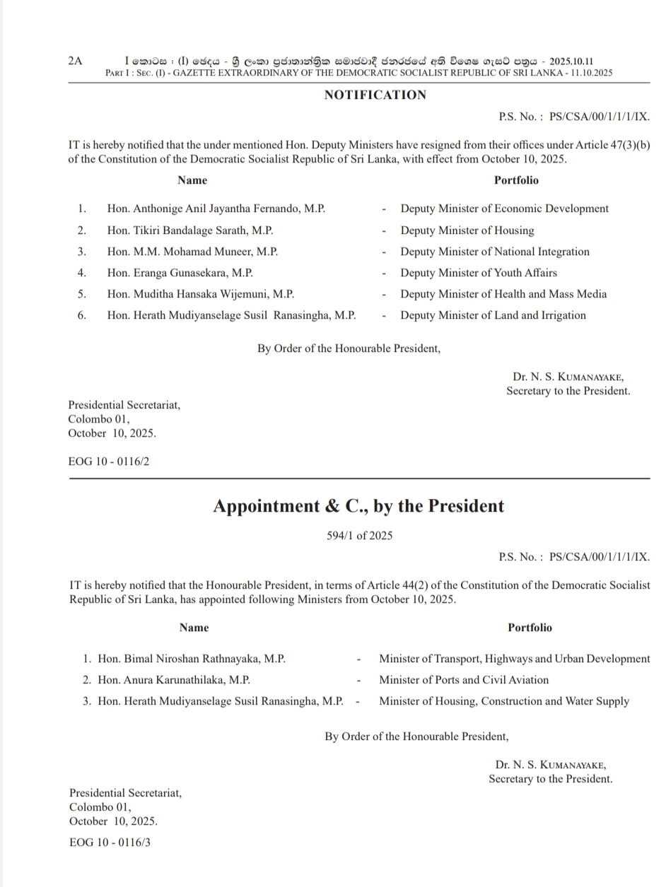 A Gazette Extraordinary dated October 11, 2025, has been issued formalizing the ministerial changes announced on Friday (10).