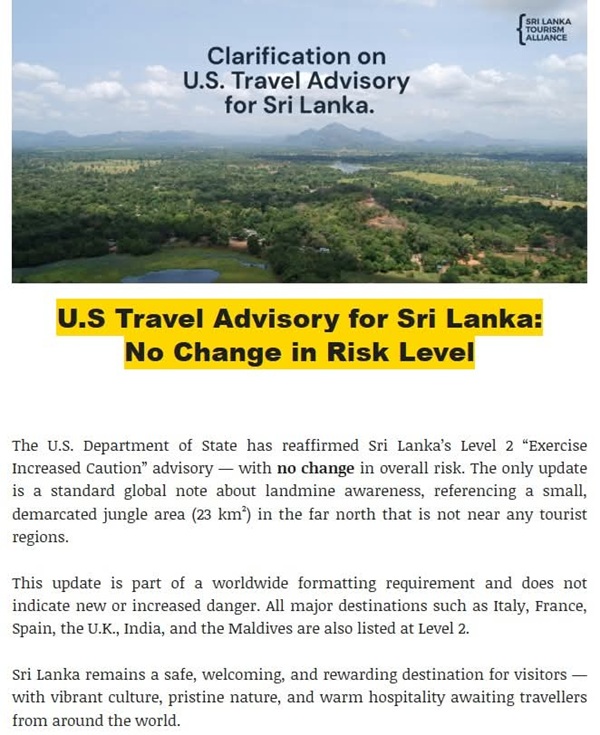 Also addressing the matter, the Sri Lanka Tourism Alliance said that the US Department of State has reaffirmed its advisory with no change in overall risk.