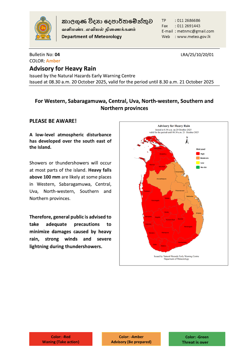 According to the advisory, showers or thundershowers are expected across most parts of the island. Heavy rainfall exceeding 100 mm is likely in the Western, Sabaragamuwa, Central, Uva, North-western, Southern and Northern provinces.