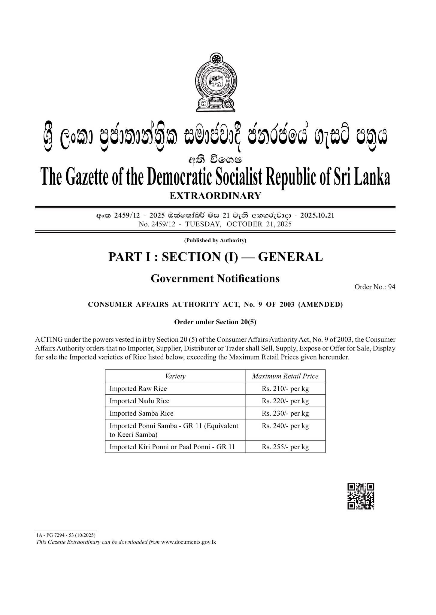 The Consumer Affairs Authority has issued an Order under Section 20(5) of the CAA Act No. 9 of 2003 setting maximum retail prices for imported rice varieties.