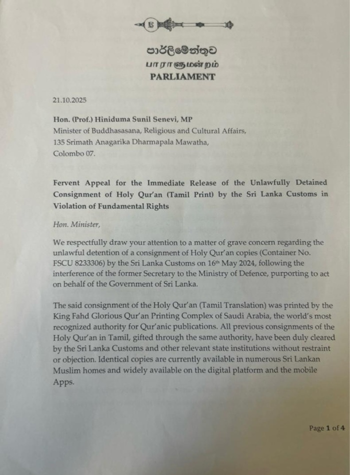 All Muslim Parliamentarians, including the government and the opposition, have requested the Minister of Religious Affairs, Hiniduma Sunil Senevi, to intervene for the immediate release of the unlawfully detained consignment of the Holy Qur’an (Tamil translation) by the Sri Lanka Customs, which they said violated Fundamental Rights.