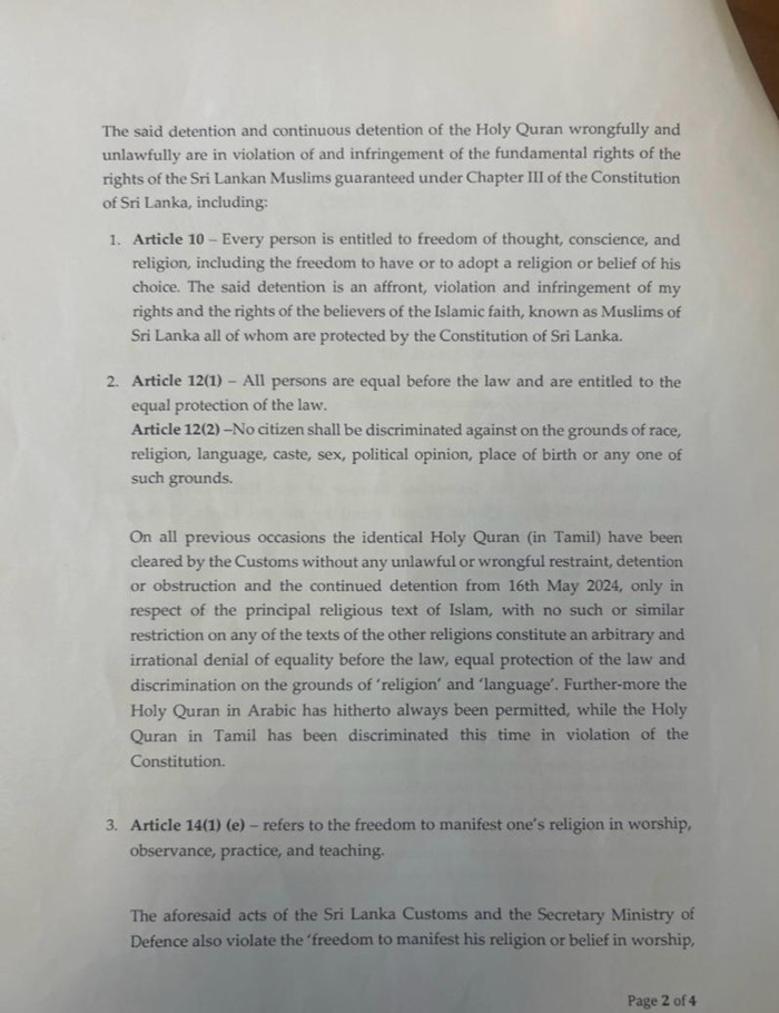 The Muslim MPs further said on all previous occasions the identical Holy Quran (in Tamil) have been cleared by the Customs without any unlawful or wrongful restraint, detention or obstruction and the continued detention from 16th May 2024, only in respect of the principal religious text of Islam, with no such or similar restriction on any of the texts of the other religions constitute an arbitrary and irrational denial of equality before the law, equal protection of the law and discrimination on the grounds of ‘religion’ and ‘language’.
