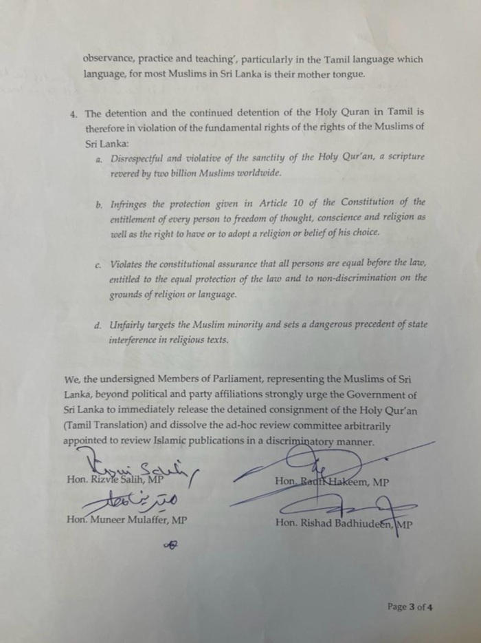 Furthermore, the Holy Quran in Arabic has hitherto always been permitted, while the Holy Quran in Tamil has been discriminated against this time in violation of the Constitution, the MPs revealed.