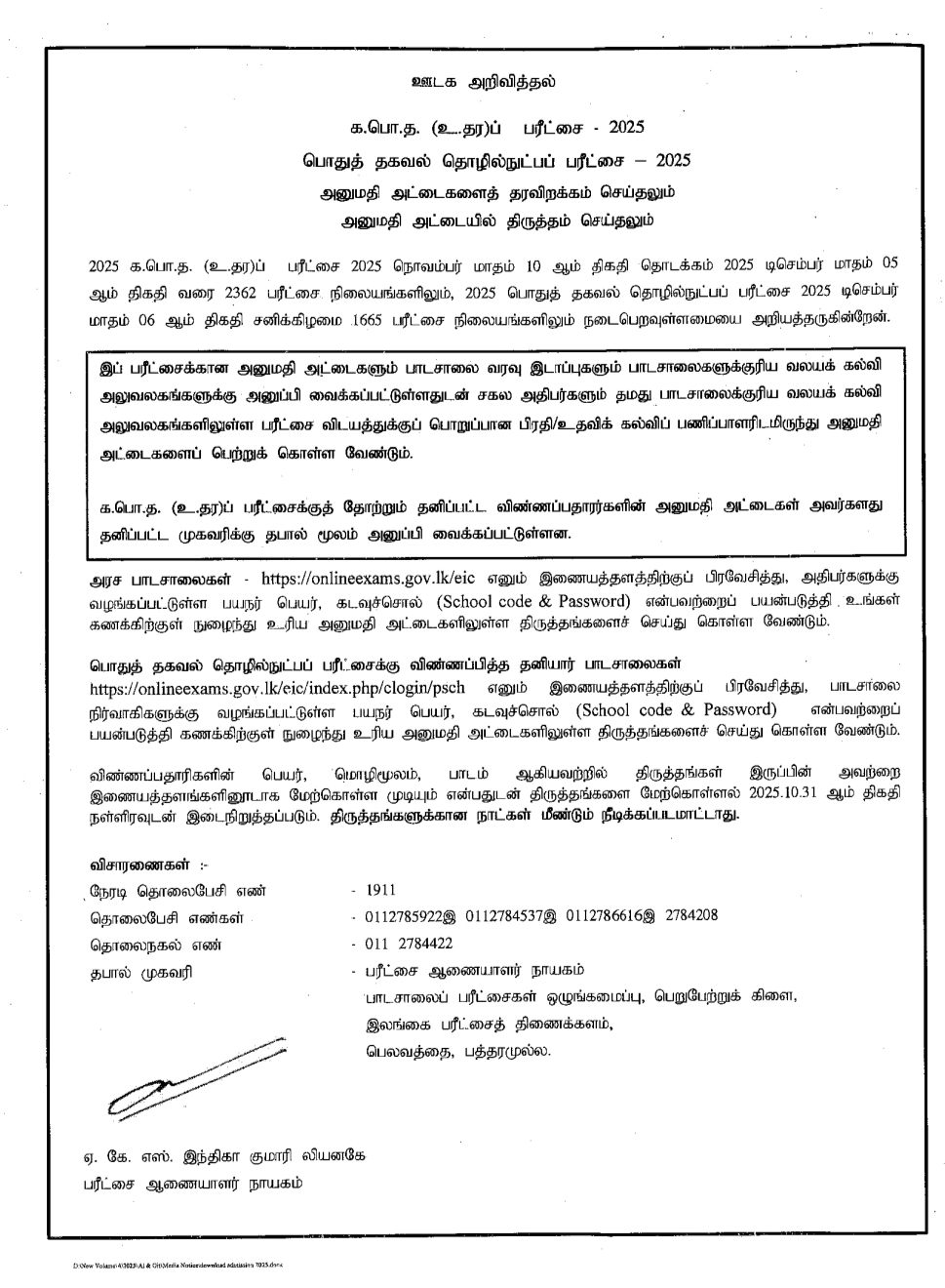 The Department of Examinations has confirmed that the 2025 G.C.E. Advanced Level (A/L) Examination will be held from 10 November to 05 December 2025. 2025-10-25