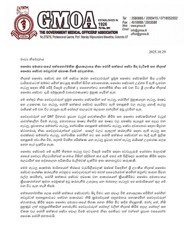 The GMOA further said that the Ministry of Health’s decision to implement arbitrary transfers should be immediately suspended and should be carried out through a proper mechanism with the participation of relevant stakeholders and without any disruption to healthcare.