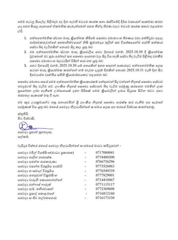The Government Medical Officers’ Association (GMOA) has announced that a nationwide trade union action will commence tomorrow (31), in protest against the arbitrary transfer procedure being implemented for doctors.