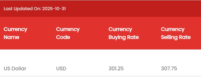 People’s Bank reports that the buying rate of the US Dollar remains unchanged at Rs. 301, while the selling rate is also unchanged at Rs. 307.63.