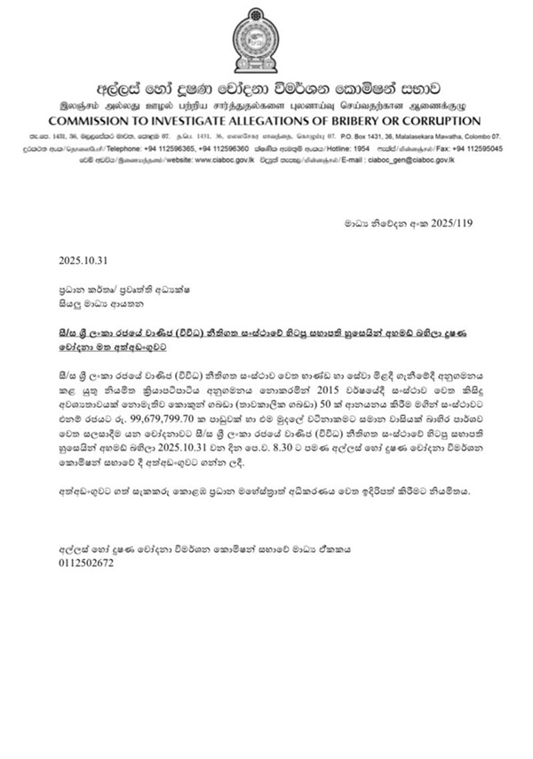 Ahmed Bahila was arrested by the Bribery Commission at around 8.30 am today (31) and is scheduled to be produced before the Colombo Chief Magistrate’s Court.