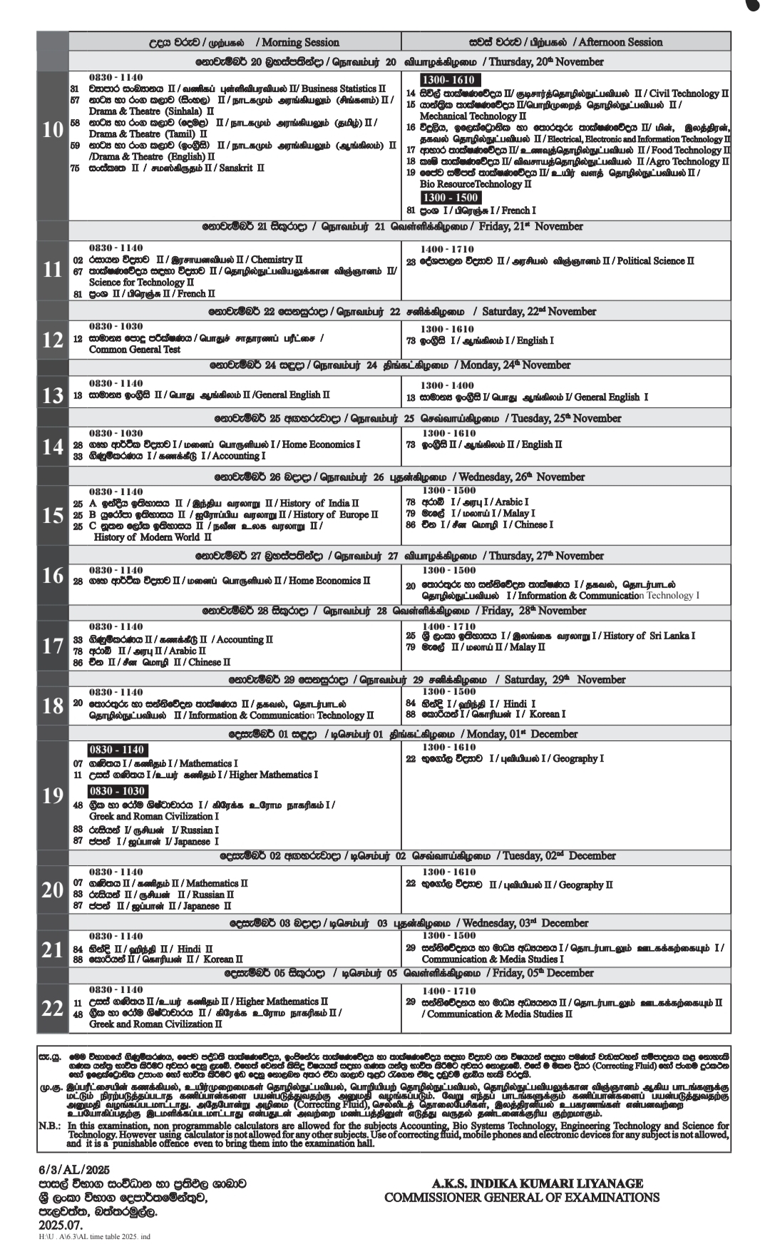 The 2025 A/L examination will be held from November 10 to December 5, covering all major subject streams.