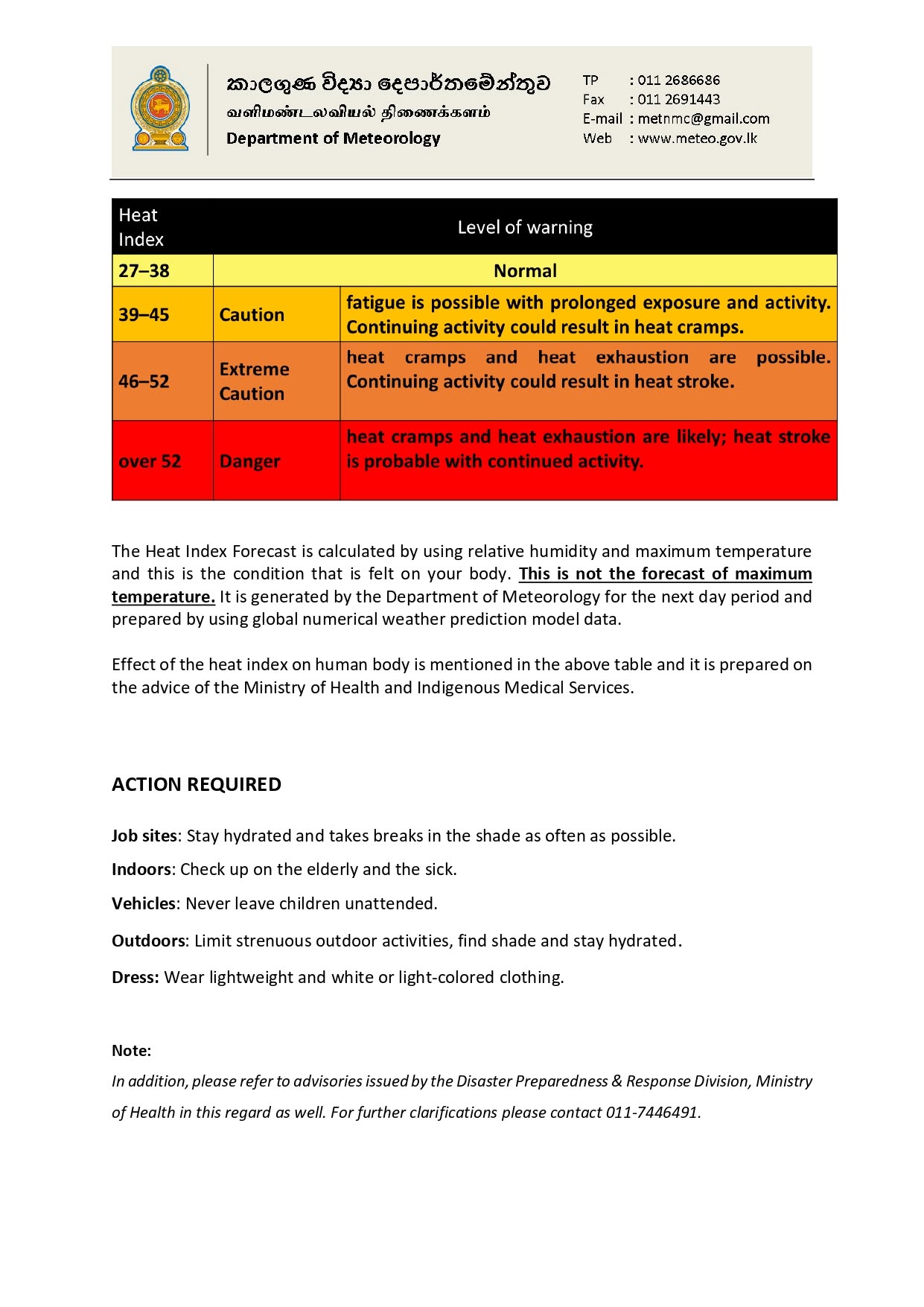 According to the advisory issued at 3:30 p.m. on November 2 and valid for November 3, 2025, the heat index — the temperature felt on the human body — is expected to increase up to the “Caution level” in several areas of the Eastern Province as well as the Polonnaruwa and Monaragala districts.