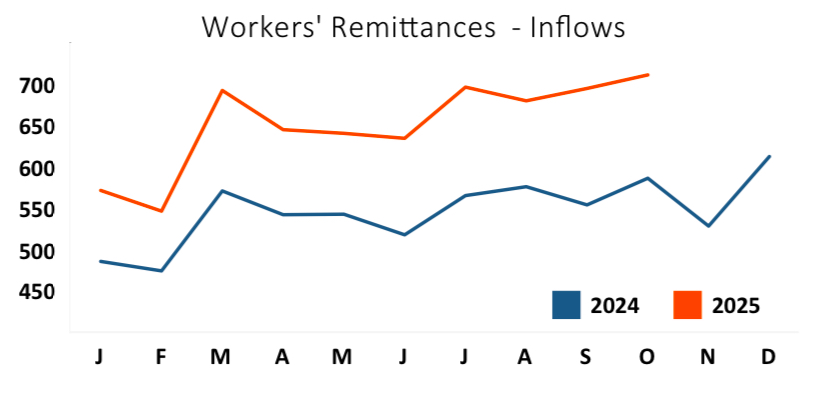 Foreign Worker remittances to Sri Lanka increased to US $712 million in October 2025, up 21.2% from US $587.7 million in October 2024, according to the Central Bank of Sri Lanka (CBSL).