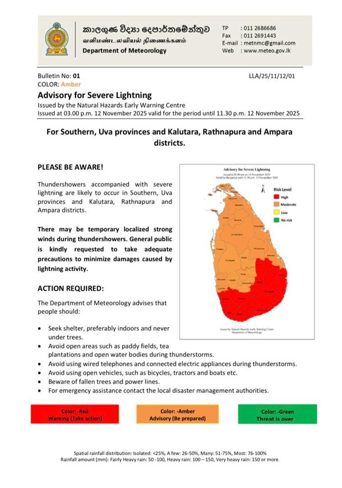 The Department of Meteorology has issued an advisory for severe lightning in the Southern and Uva provinces, and the Kalutara, Rathnapura and Ampara districts.