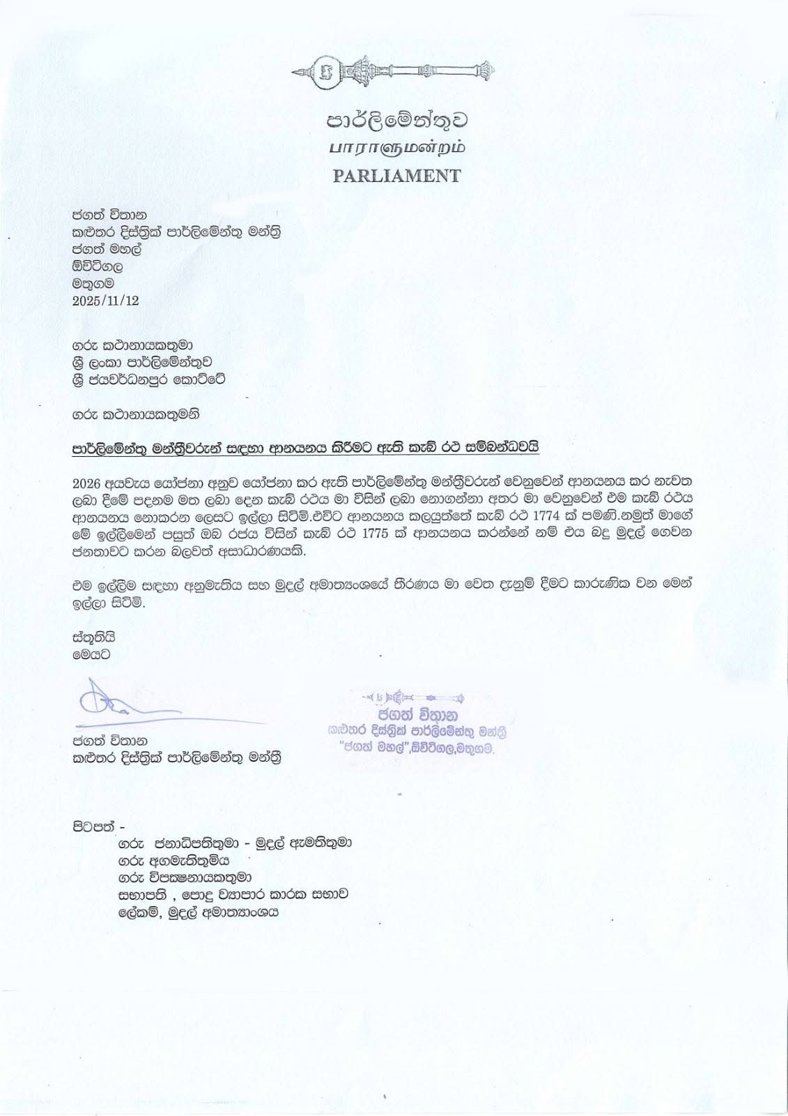 MP Jagath Vithana says he will not accept the cab allocated to him under the 2026 budget proposal, which includes the import of vehicles for Members of Parliament.