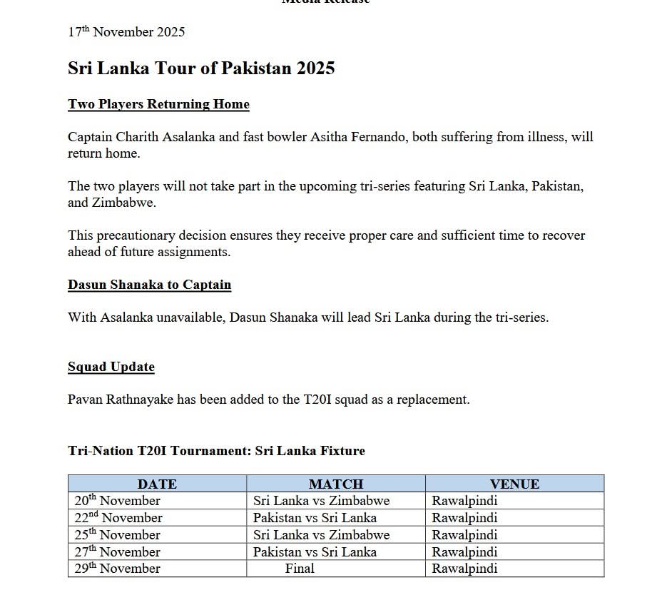 Official : Dasun Shanaka will captain Sri Lanka in the T20I series as Charith Asalanka will return home due to illness along with Asitha Fernando. 2025-11-17