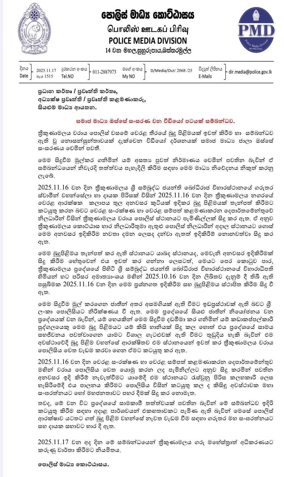 Sri Lanka Police have issued a clarification statement regarding a video currently circulating on social media platforms, showing a commotion that occurred during the installation of a Buddha statue in Trincomalee.