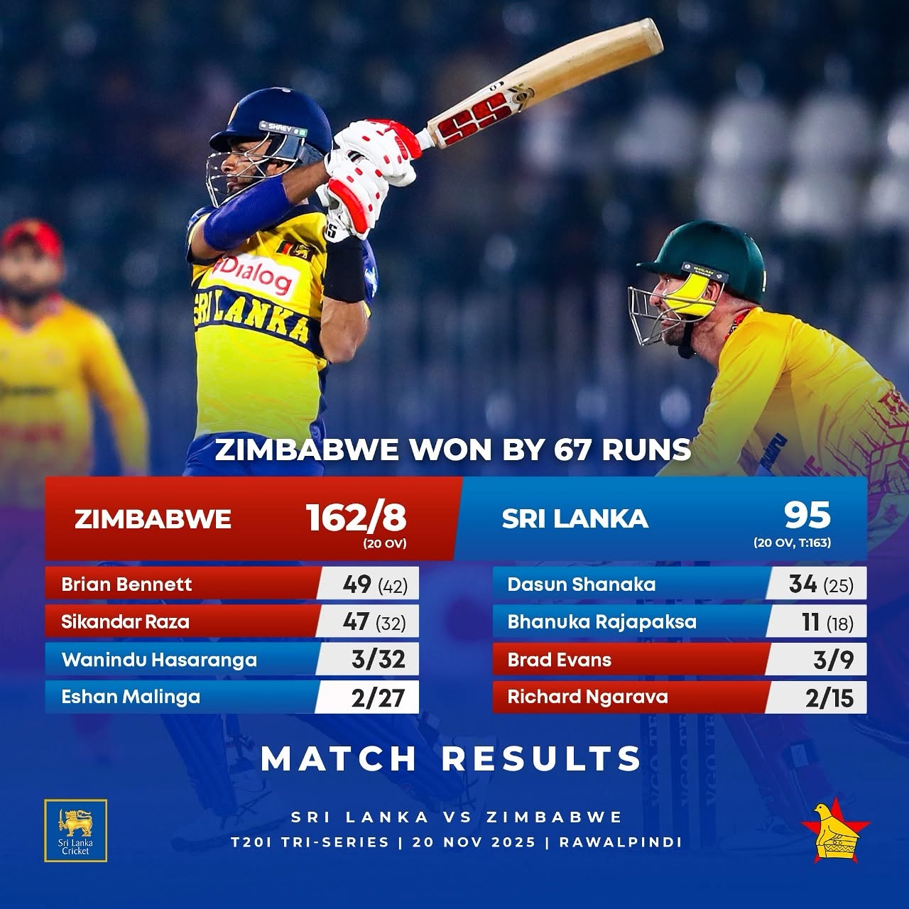 Sri Lanka suffered a heavy defeat after being bowled out for just 95 runs in their chase against Zimbabwe today. Set a target of 163, Sri Lanka collapsed early and never recovered, handing Zimbabwe a comfortable win.