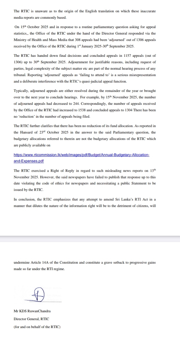 The Right to Information Commission of Sri Lanka (RTIC) has expressed serious concern over chronic understaffing, delays in recruitment, and recent media misreporting that it says undermines its quasi-judicial functions.