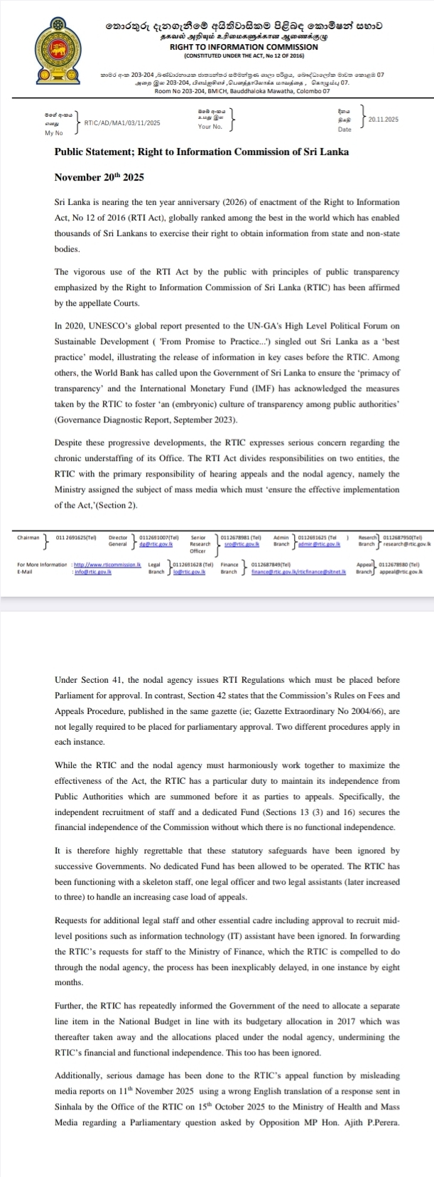 The Right to Information Commission of Sri Lanka (RTIC) has expressed serious concern over chronic understaffing, delays in recruitment, and recent media misreporting that it says undermines its quasi-judicial functions.