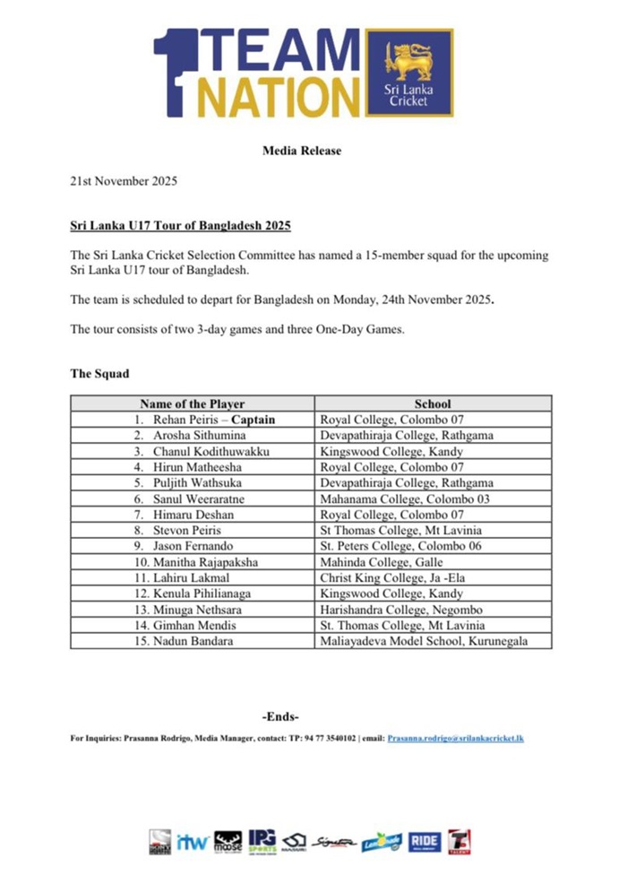The Sri Lanka Cricket Selection Committee has named a 15-member squad for the upcoming Sri Lanka U-17 tour of Bangladesh.