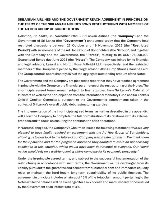 SriLankan Airlines and the Government of Sri Lanka have announced that they have reached an agreement in principle with the Ad Hoc Group of Bondholders on the financial parameters of the restructuring of its USD 175 million in Guaranteed Bonds due June 2024.