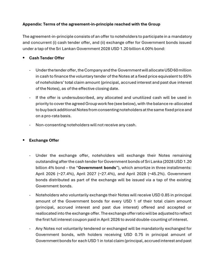 The in-principle agreed terms for the restructuring remain subject to final approval from Sri Lanka’s Cabinet of Ministers, as well as the non-objections of the International Monetary Fund (IMF) and Sri Lanka’s official Creditor Committee, pursuant to the Government’s commitments taken in the context of Sri Lanka’s overall public debt restructuring exercise.