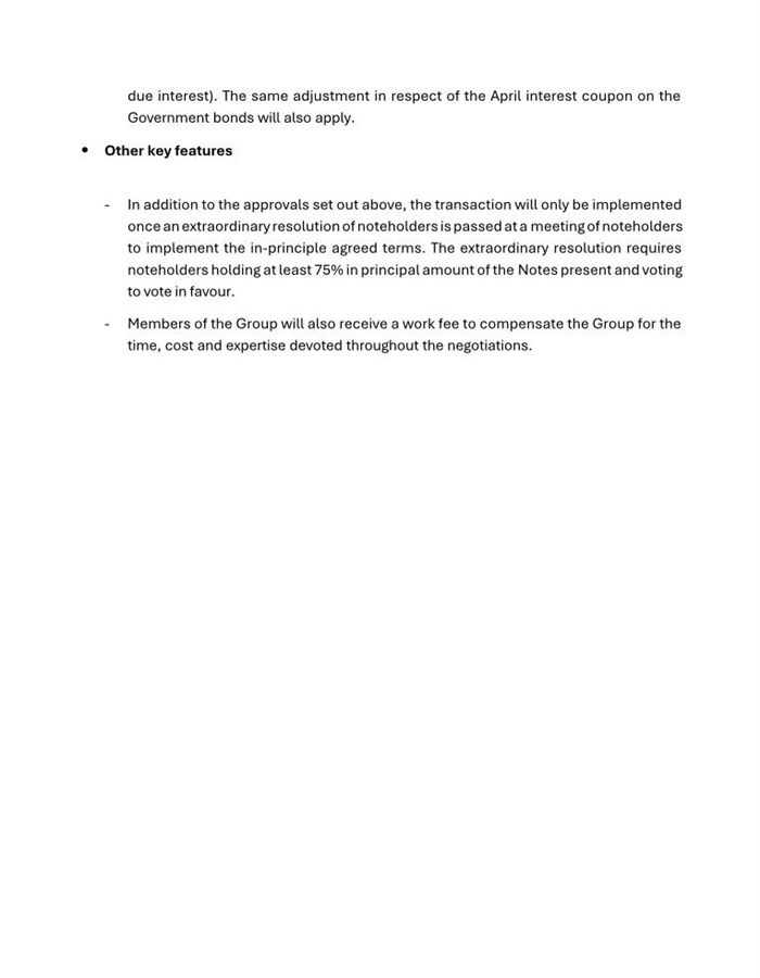 Under the agreed terms, the restructuring will include a 15% haircut on the total claim amount of the Notes, with the remaining balance to be exchanged for a combination of cash and medium-term Government bonds carrying a 4% interest rate.