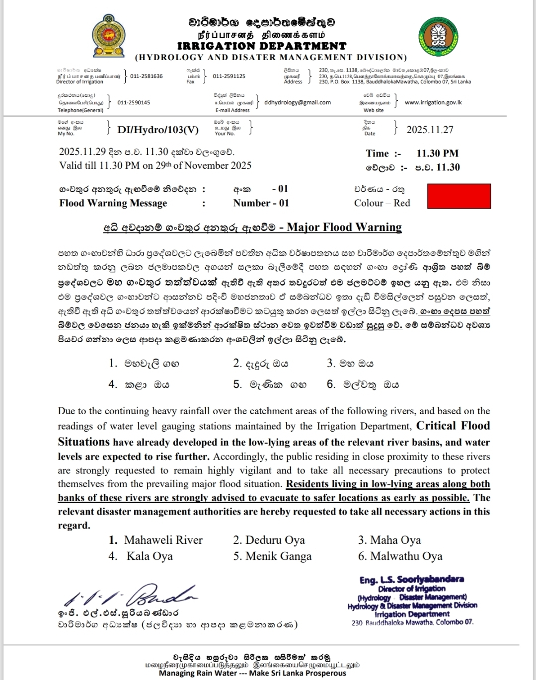 The Irrigation Department warns of critical flood situations in low-lying areas along: