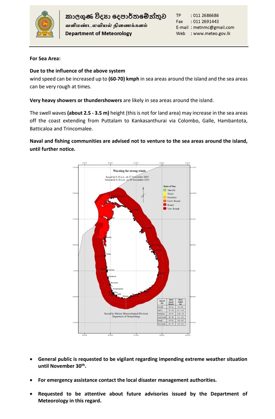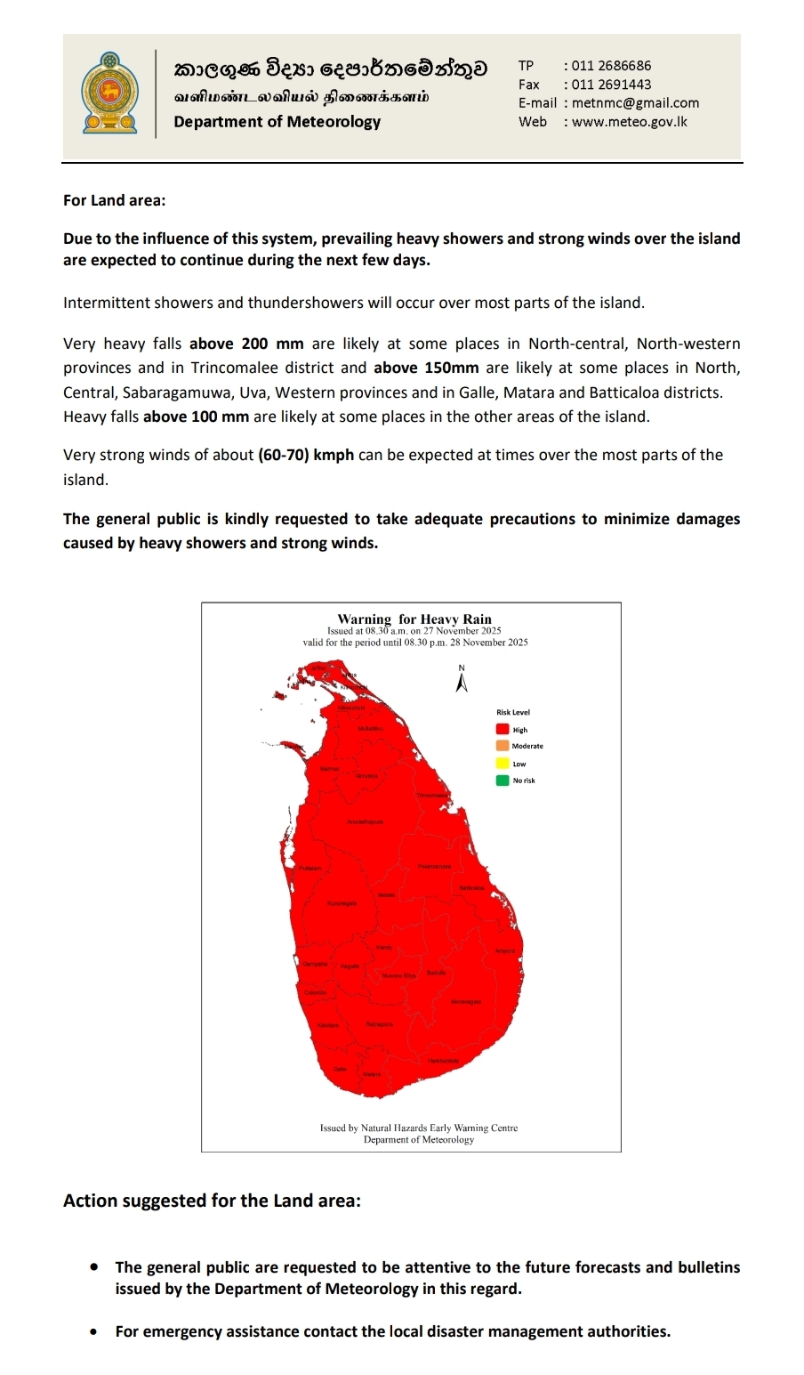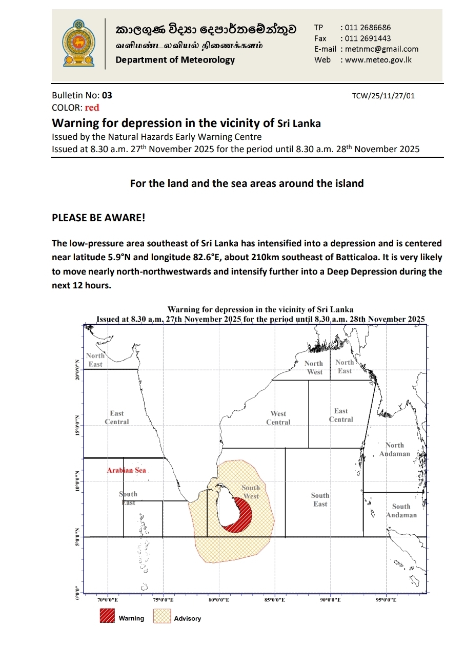 The low-pressure area southeast of Sri Lanka has intensified into a depression and is centered near latitude 5.9°N and longitude 82.6°E, about 210km southeast of Batticaloa. It is very likely to move nearly north-northwestwards and intensify further into a Deep Depression during the next 12 hours.