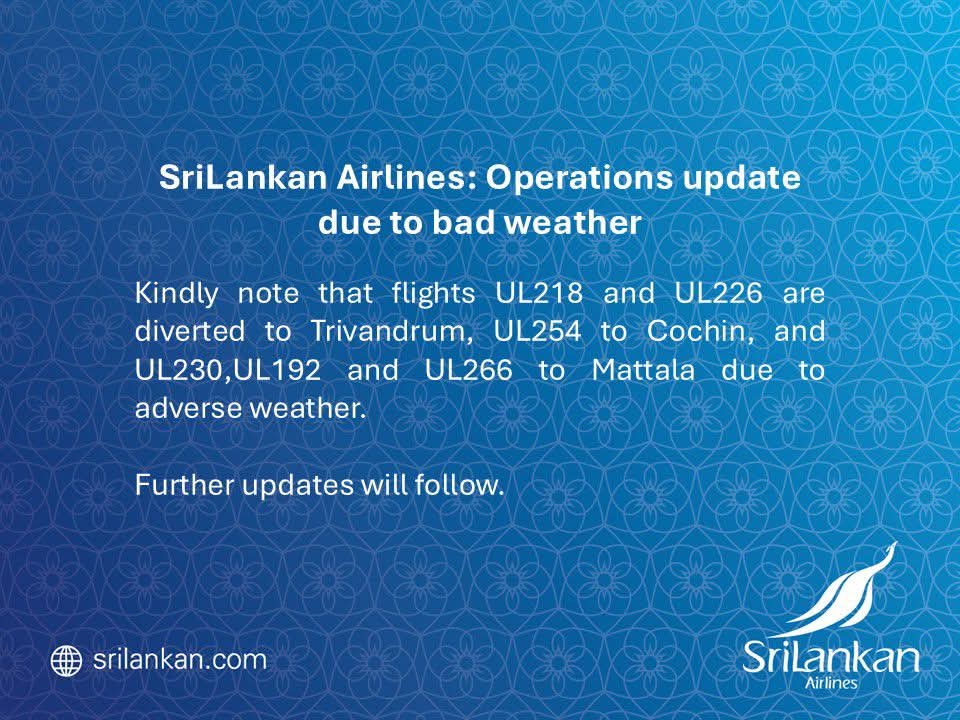 SriLankan Airlines flights UL218 and UL226 are diverted to Trivandrum, UL254 to Cochin, and UL230,UL192 and UL266 to Mattala due to adverse weather. 2025-11-28