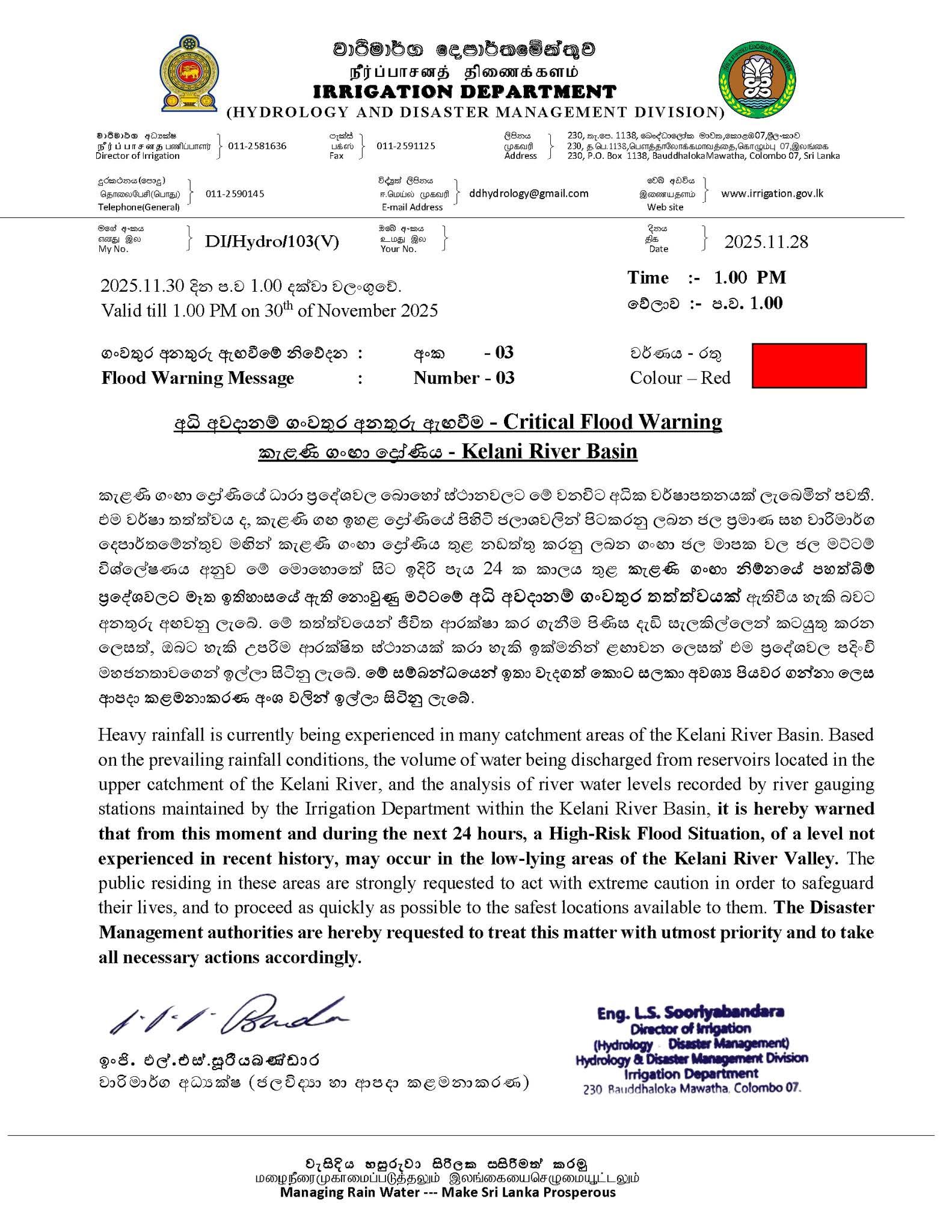 The Irrigation Department warns that from now and over the next 24 hours, a high-risk flood situation — at levels not experienced in recent history — may occur in low-lying areas of the Kelani Valley due to heavy rainfall and increased reservoir discharge