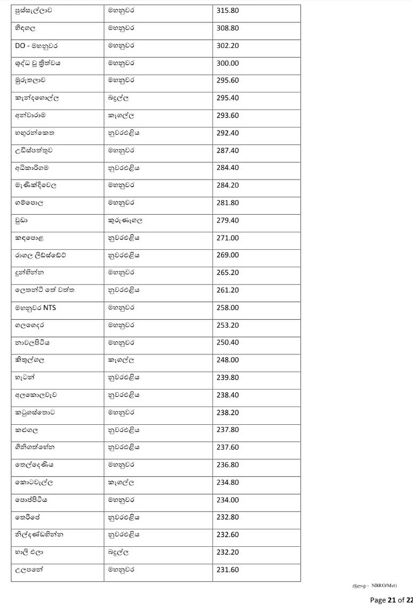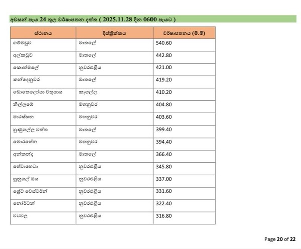According to the Disaster Management Centre, between 403 mm and 442 mm of rainfall has been recorded in the Alkaduwa and Kandenuwara areas in the Matale District, Kotmale area in the Nuwara Eliya District, Dotheloya Estate in the Kegalle District, and in the Nillambe and Marassana areas in the Kandy District.