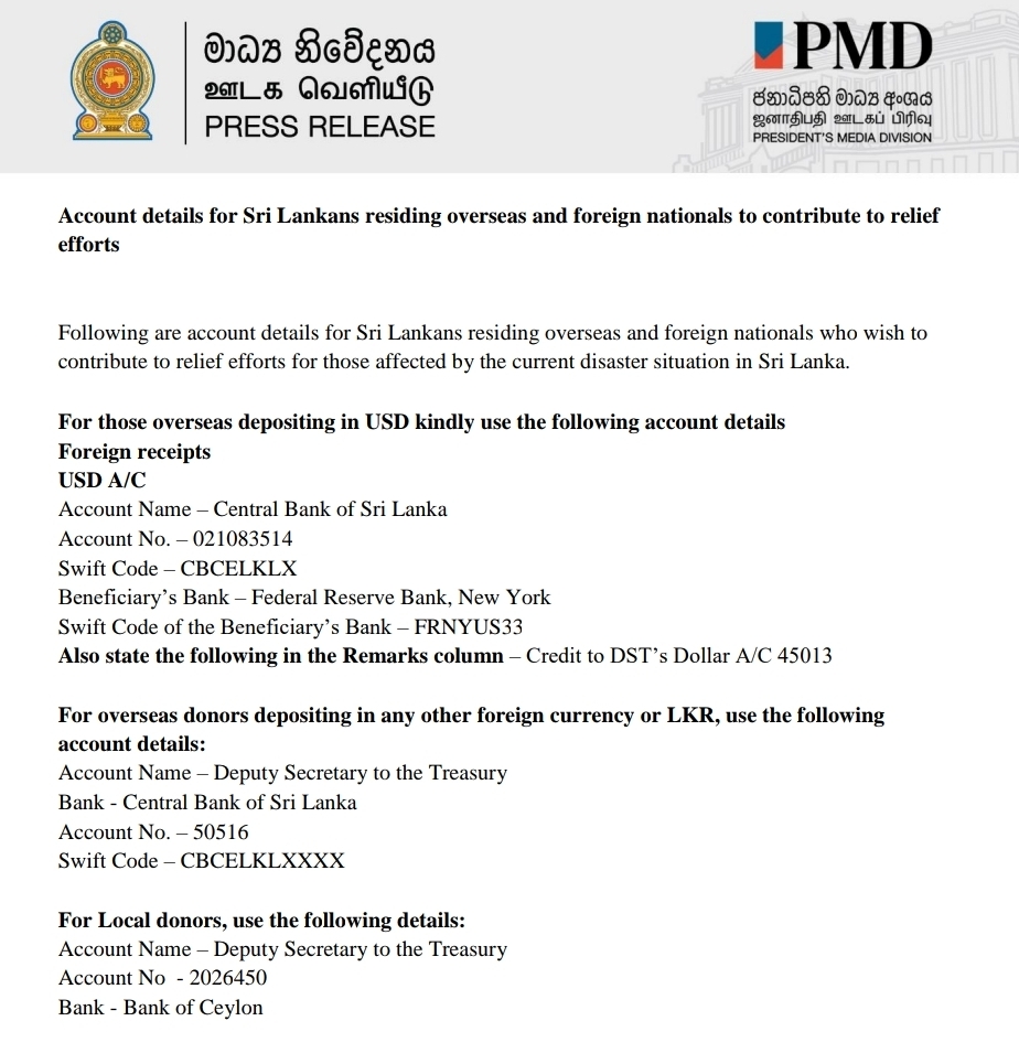 Details of the designated bank accounts are available at Sri Lankan diplomatic missions abroad and at foreign missions based in Sri Lanka. To streamline the process, two separate accounts have been established to accept donations in both local currency and US Dollars.