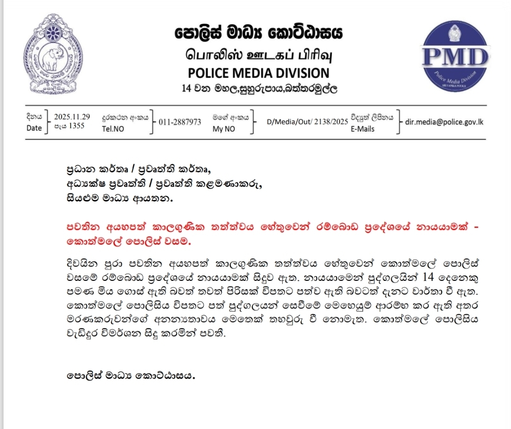 Police said today that 14 people have been confirmed dead following a landslide in the Kotmale area, while 21 individuals remain missing after a separate landslide in Thulhiriya.
