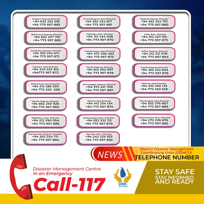 The Disaster Management Centre has issued the telephone numbers of District Disaster Management Coordinating Units (DDMCU) for the public to contact for assistance amidst the inclement weather in Sri Lanka.