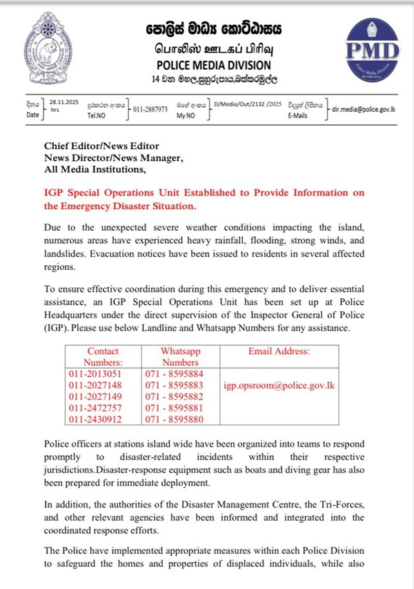 Sri Lanka Police has established the IGP Special Operations Unit to provide information on the Emergency Disaster Situation.