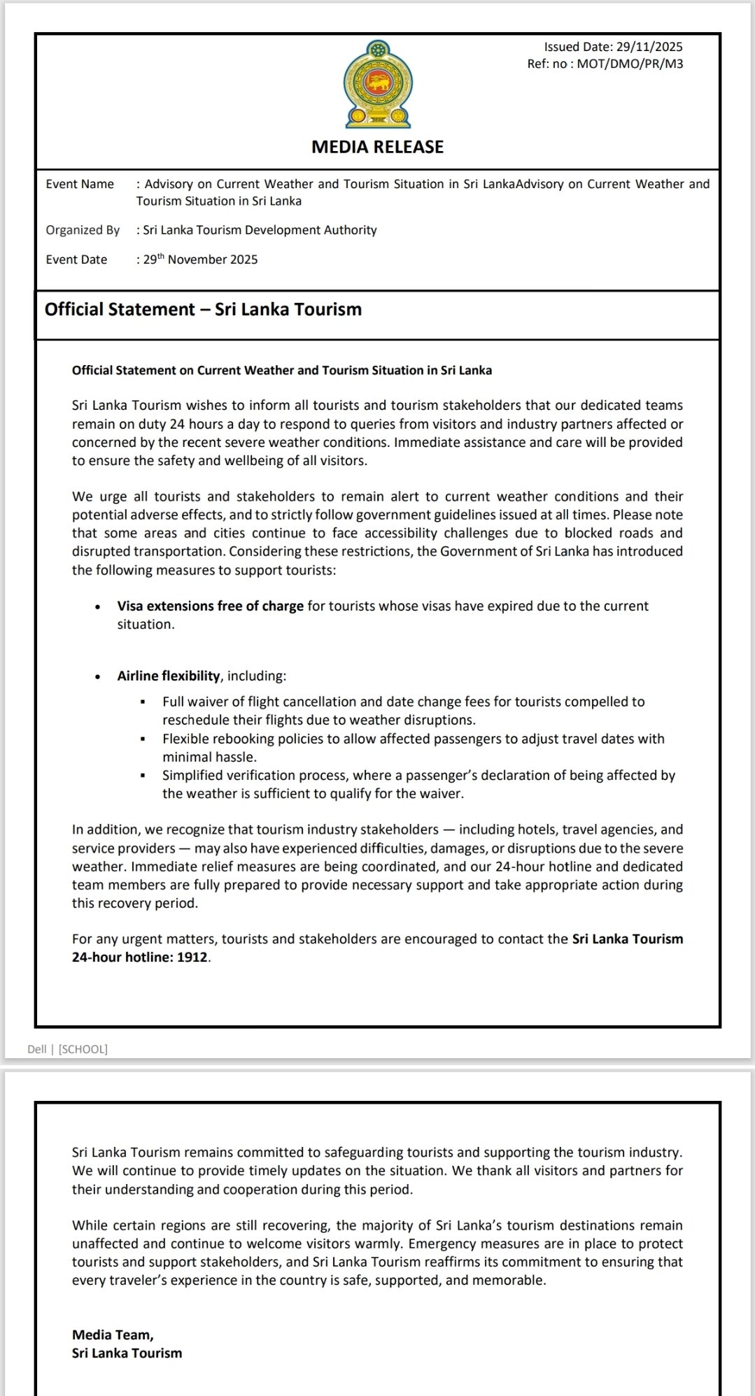 Sri Lanka has announced special support measures for tourists affected by the ongoing severe weather, including free visa extensions and flexible airline policies to ease travel disruptions.