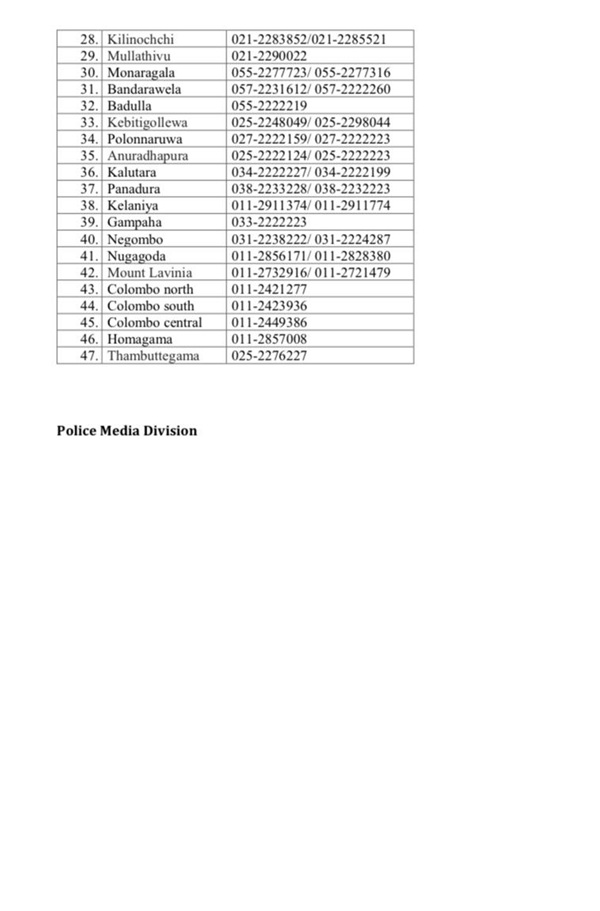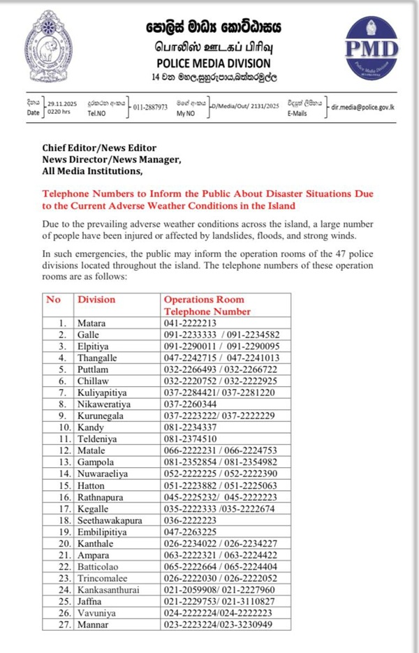 Sri Lanka Police has introduced emergency Telephone Numbers for the public to inform about disaster situations due to the adverse weather conditions in the country.