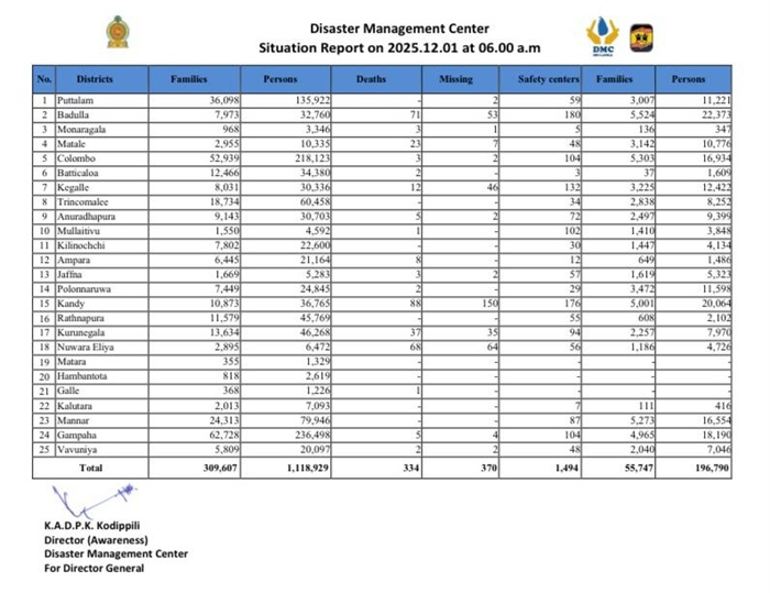 The DMC states the highest number of deaths has been reported in the Kady District (88), followed by Badulla (71), and Nuwara Eliya (68).
