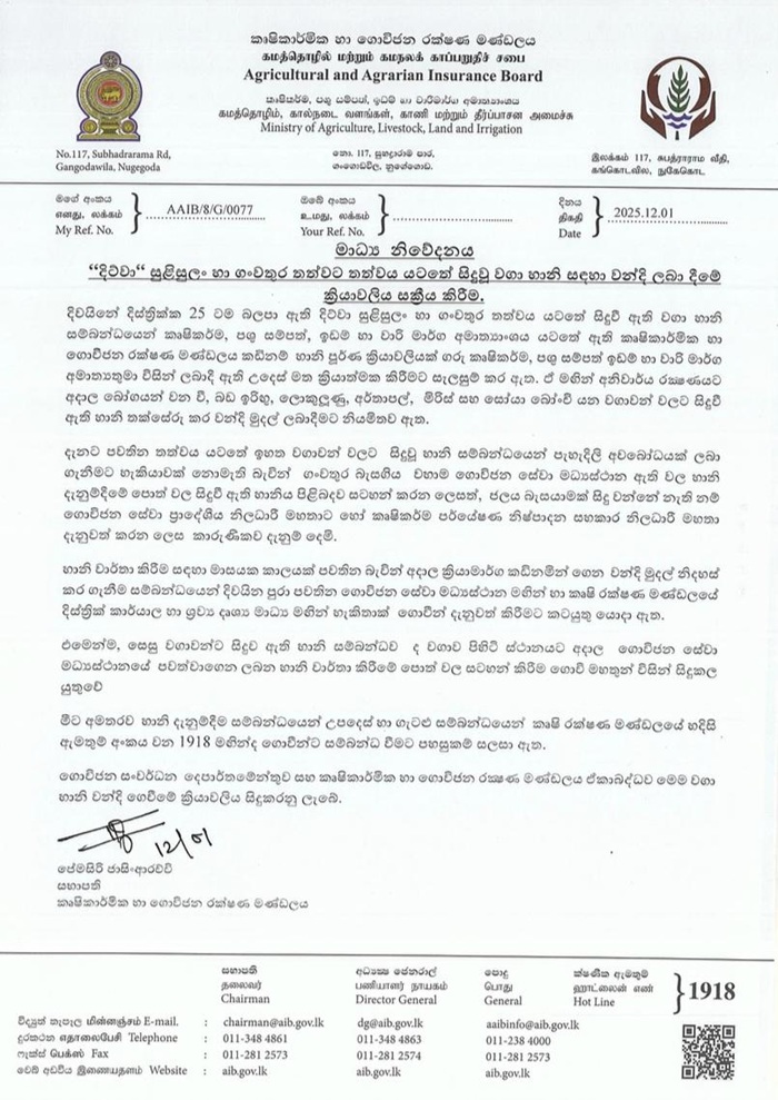 The Agricultural and Agrarian Insurance Board, under the Ministry of Agriculture, Livestock, Lands, and Irrigation, has planned to implement an expedited compensation process as instructed by the subject Minister, for crop damages caused by Cyclone Ditwah and floods that affected all 25 districts of the island.